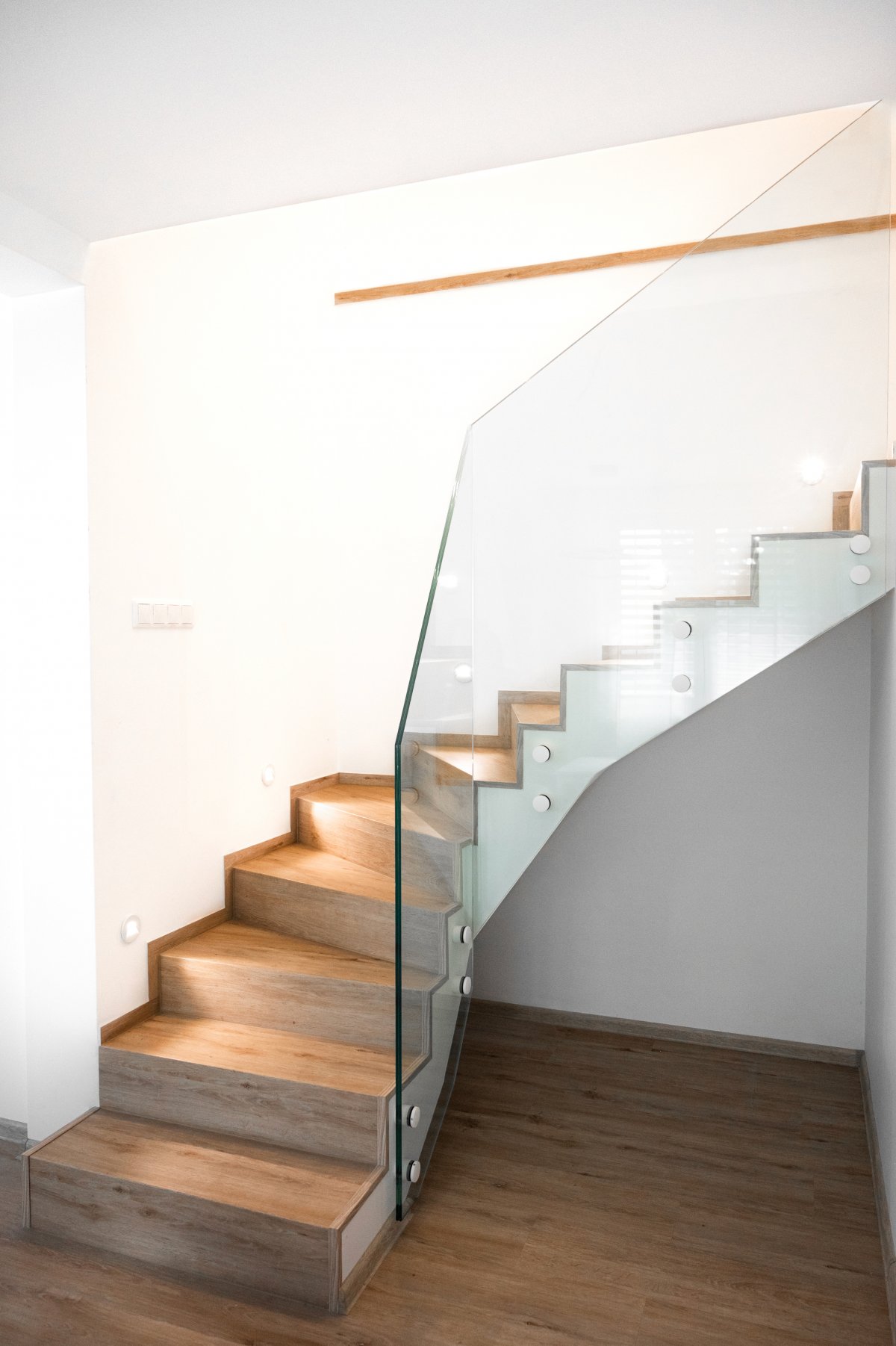 Sklo perfektně doplňuje dřevěné schody i podlahy