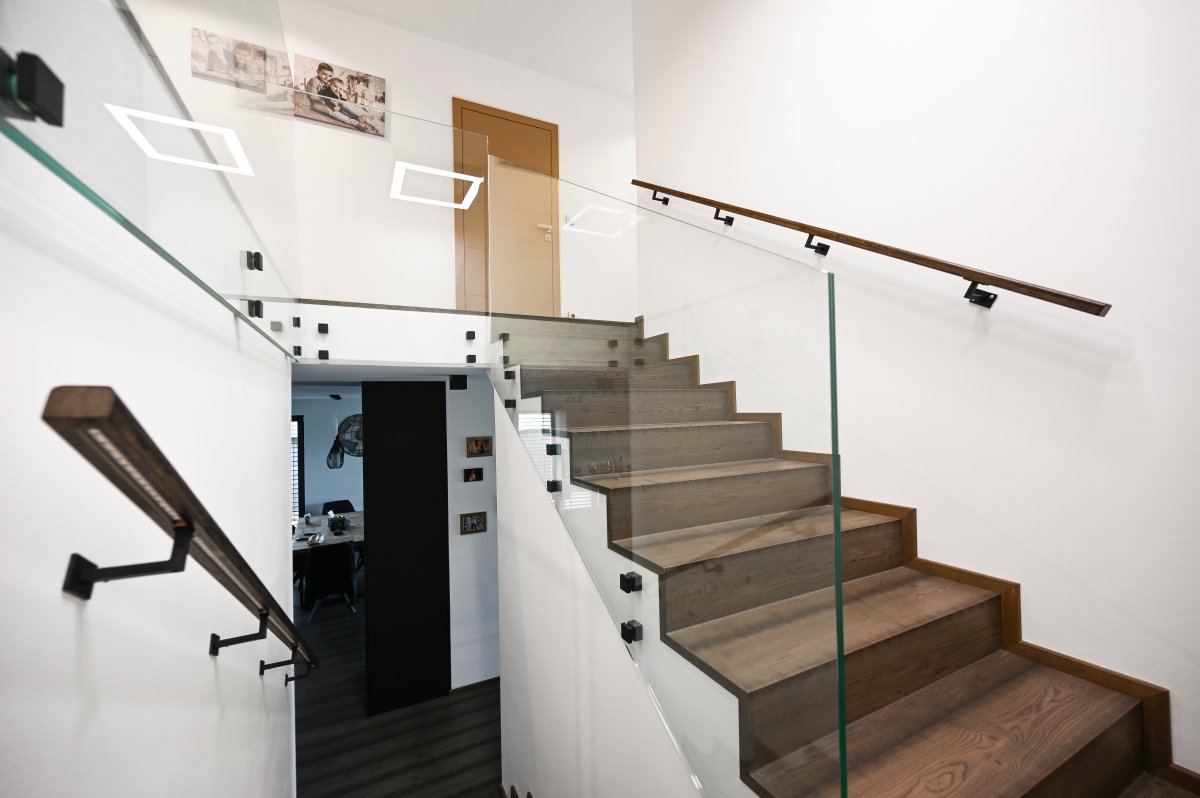 celoskleněné zábradlí se hodí jak na galerii, tak i na schodiště. Doplněno o led