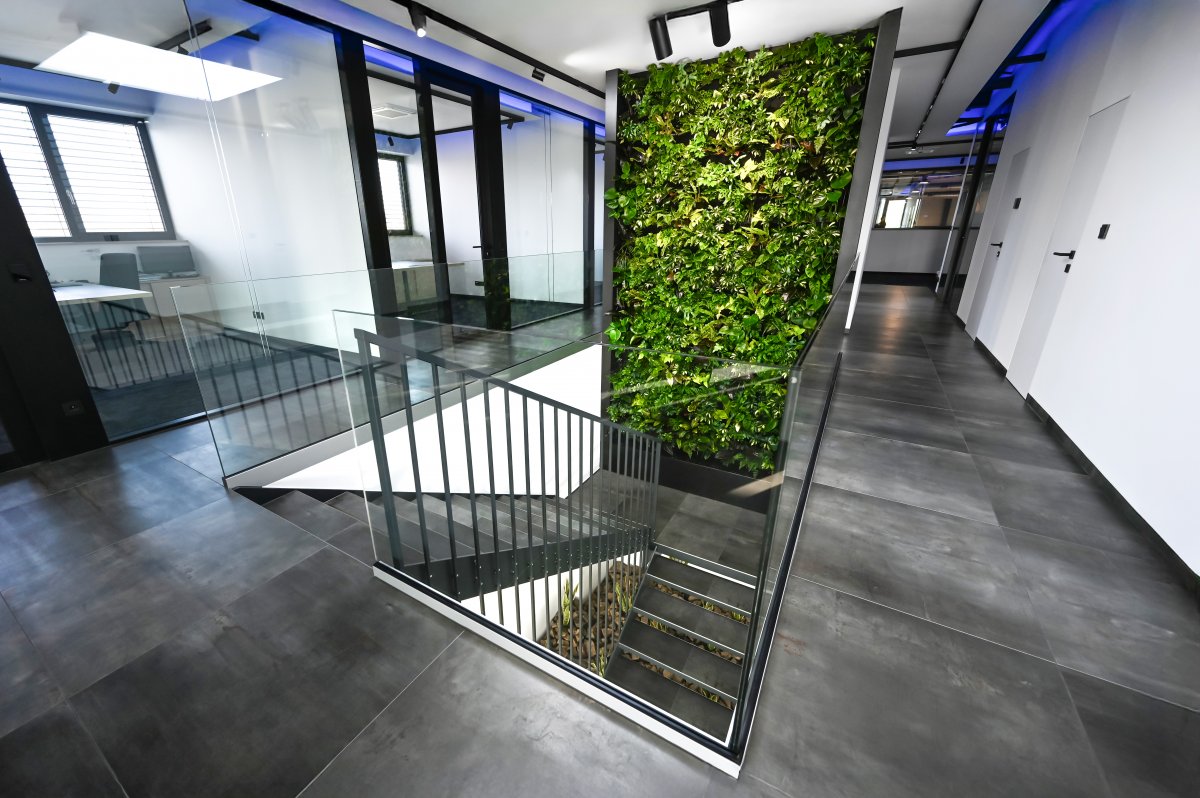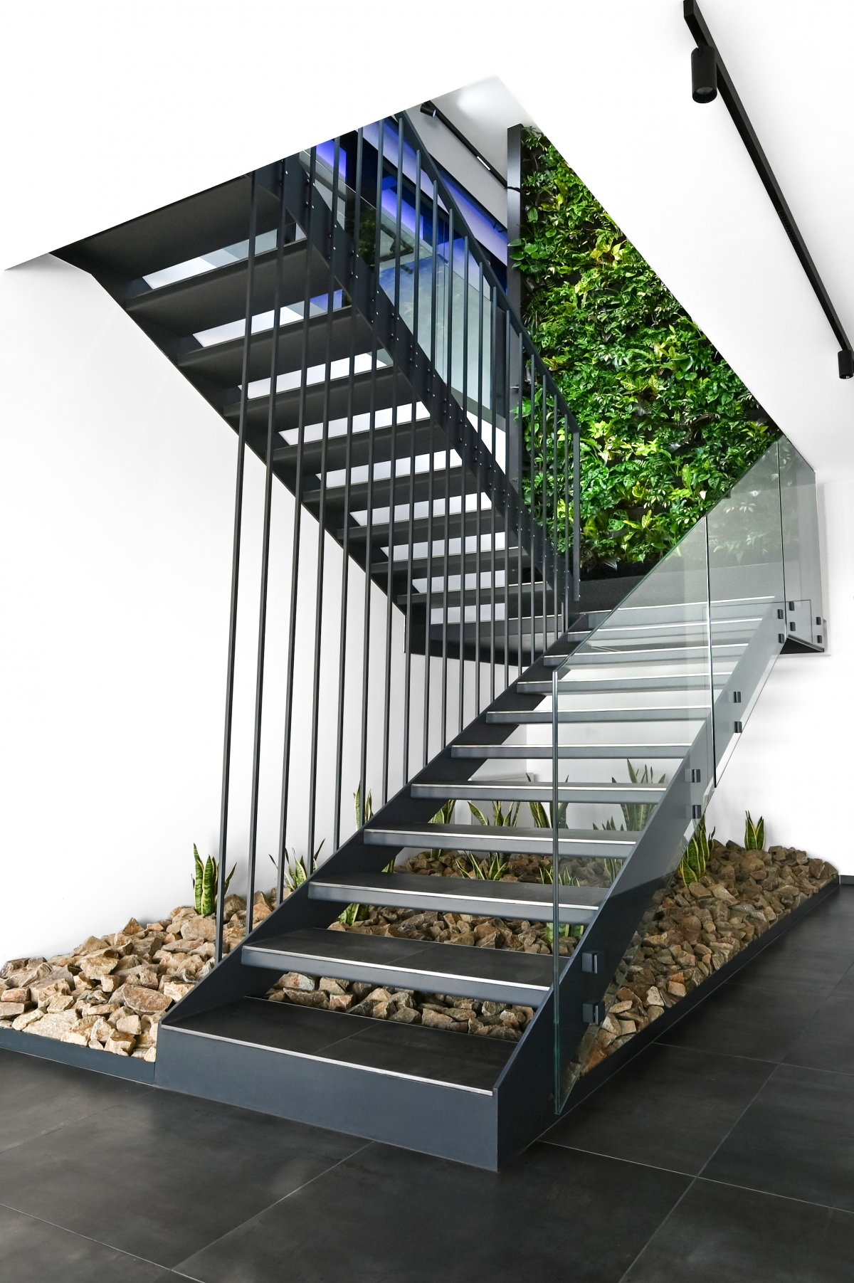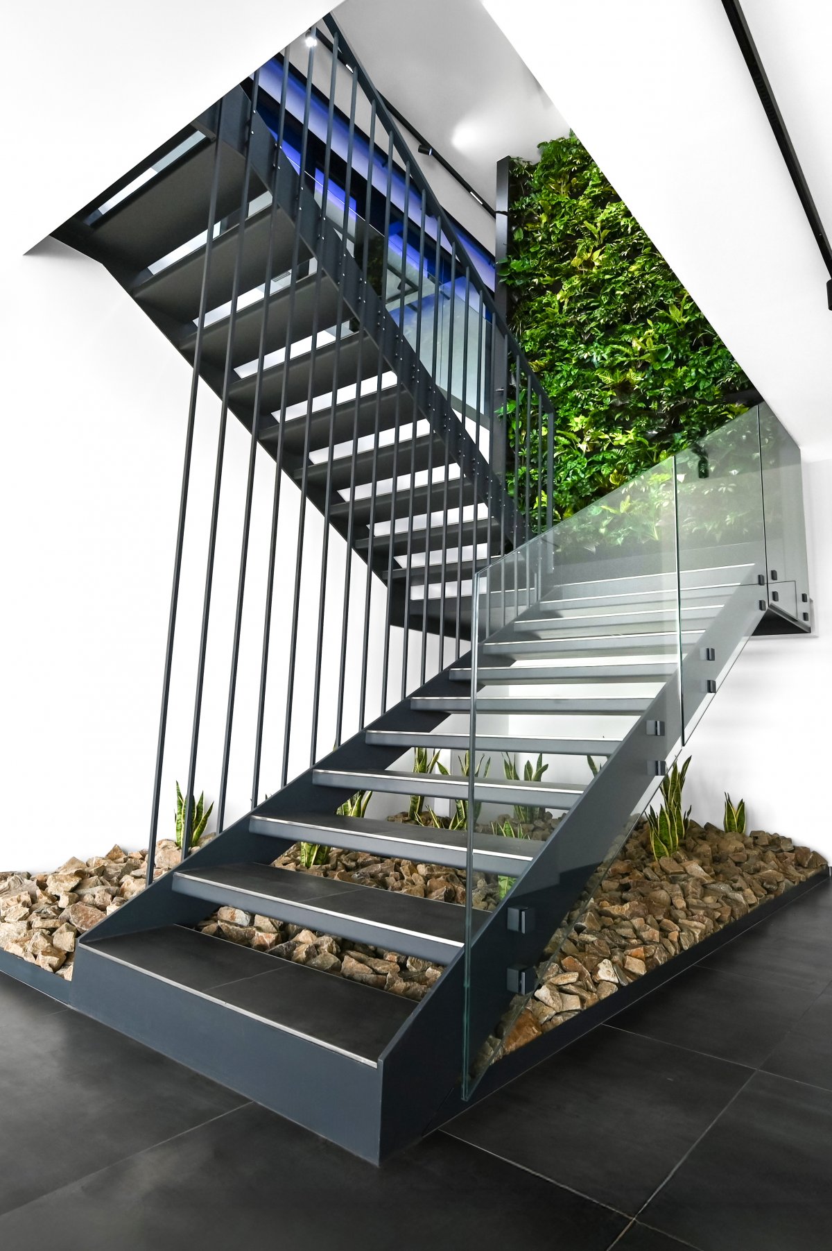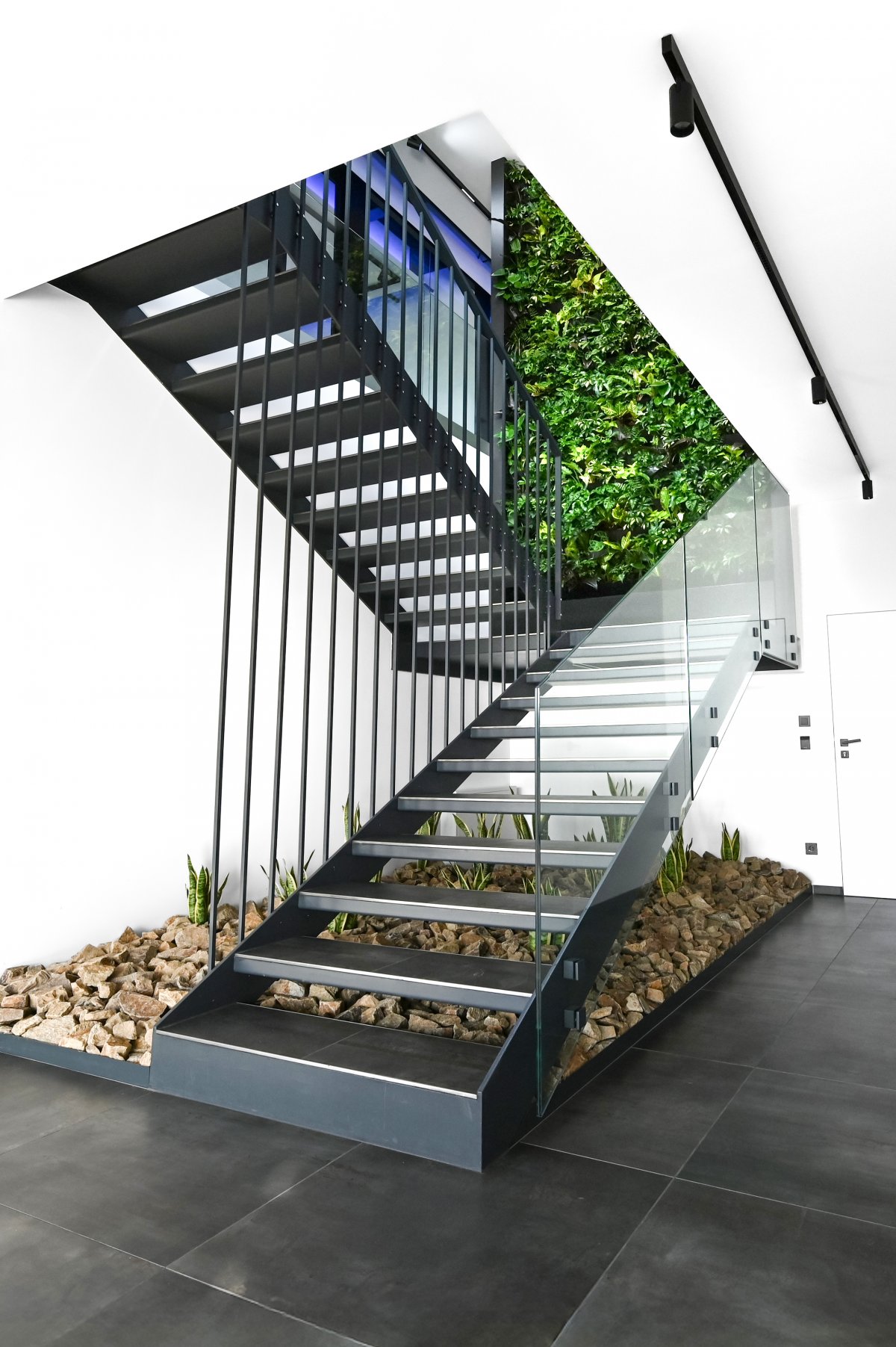 V Uherčicích jsme realizovali kombinaci skleněného zábradlí a subtilních ocelových tyčí, která dodává interiéru lehkost, čistotu a moderní výraz.