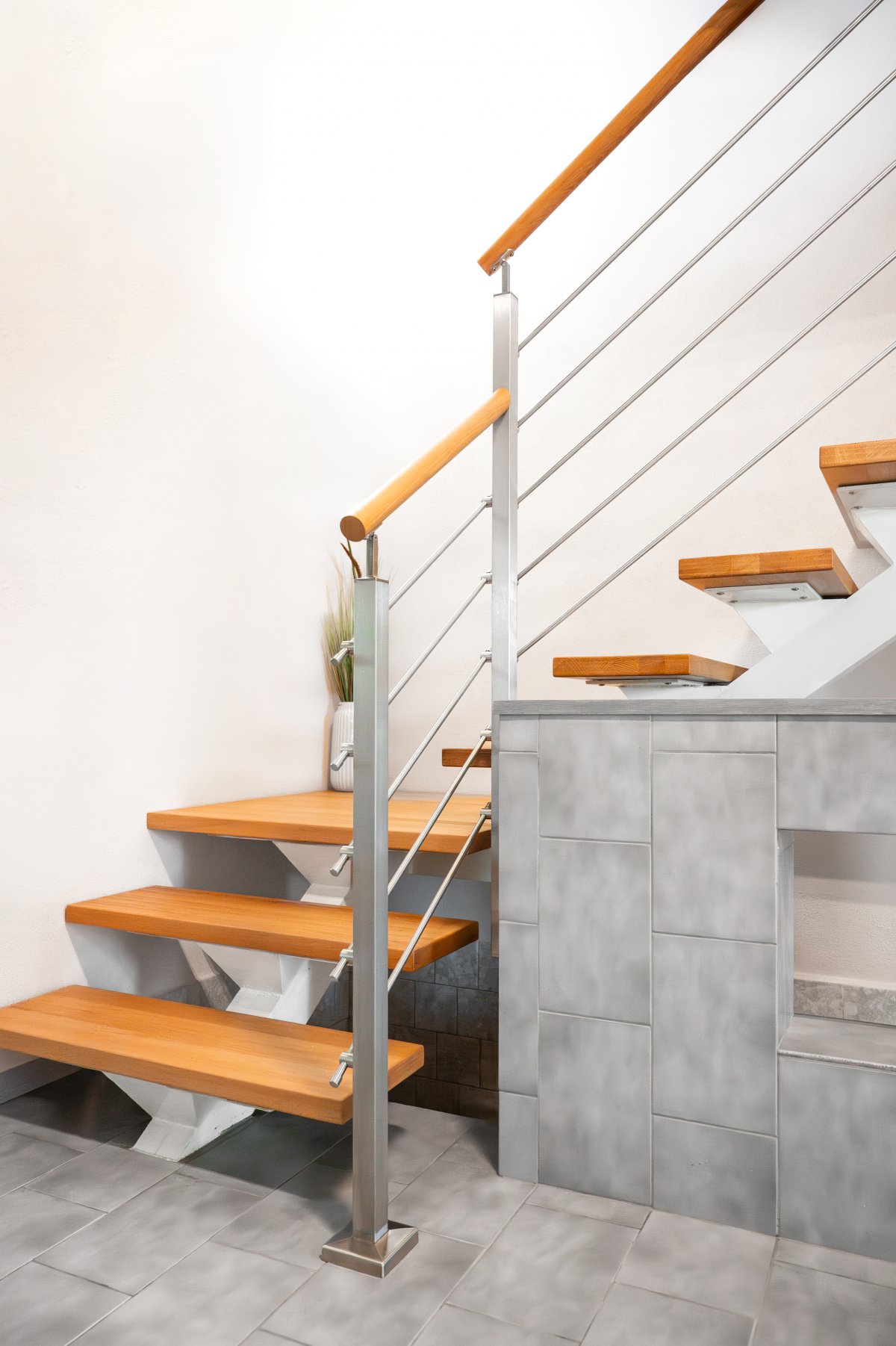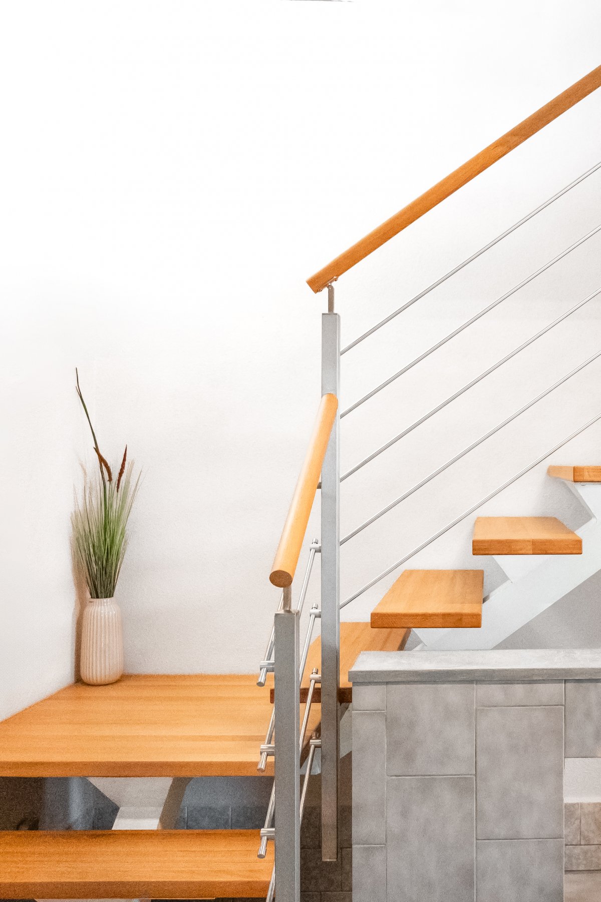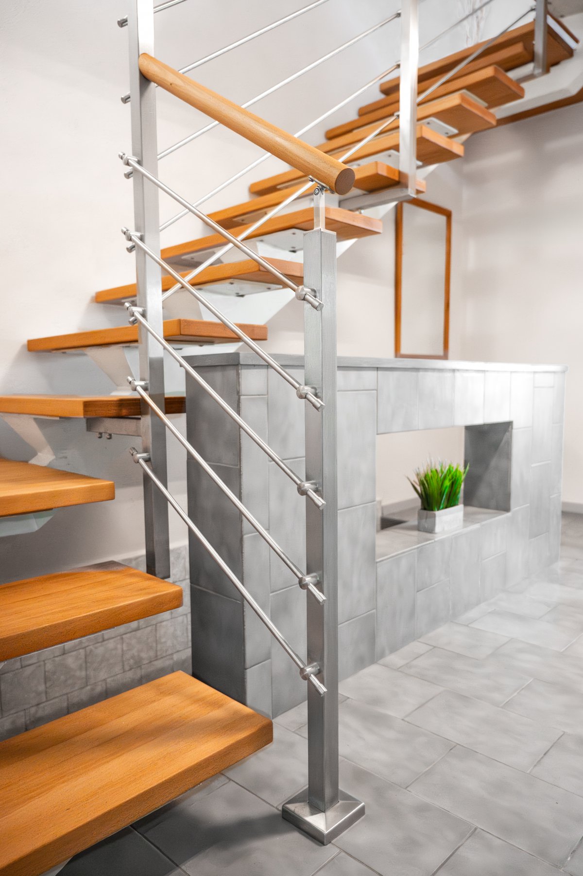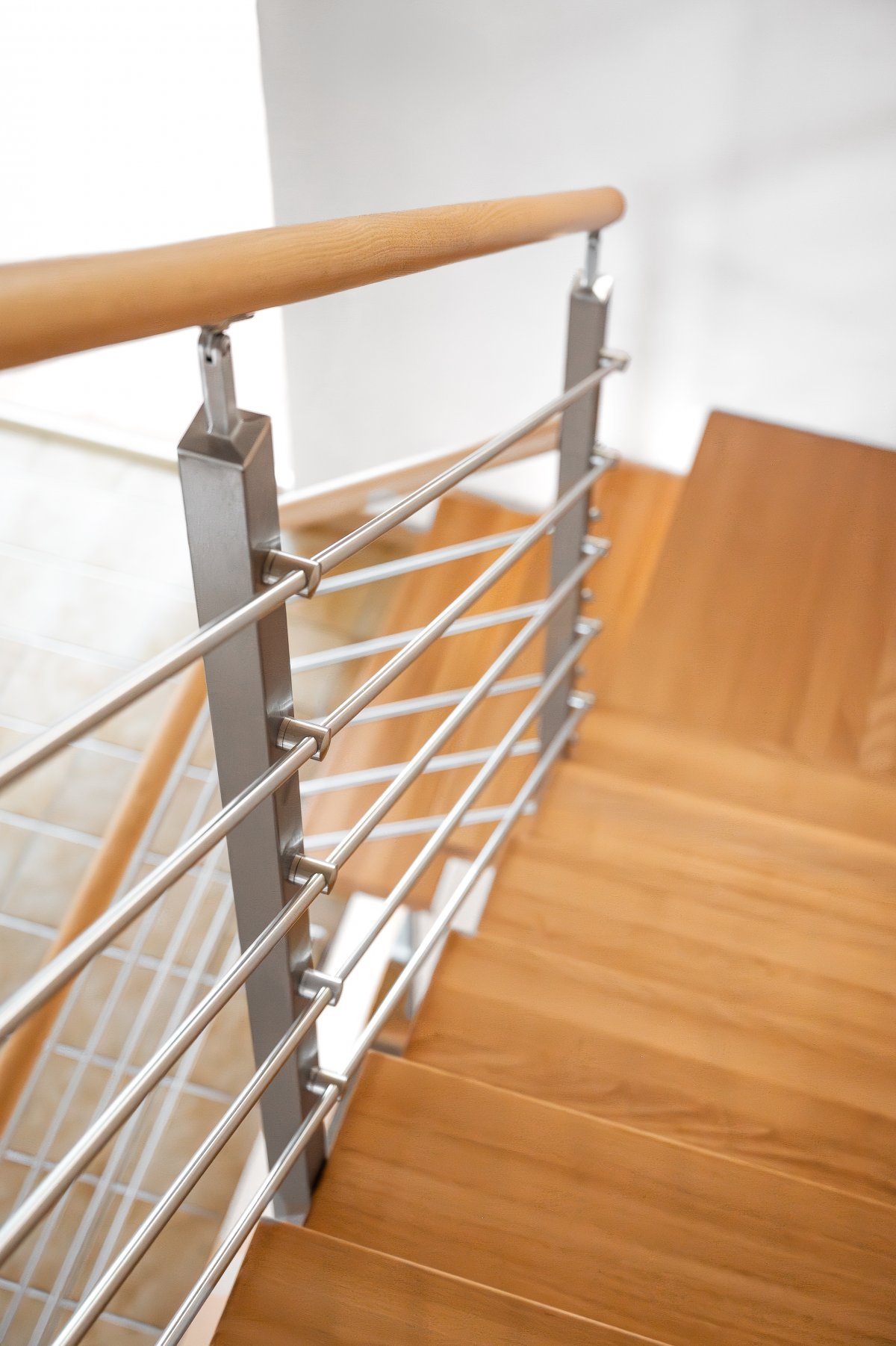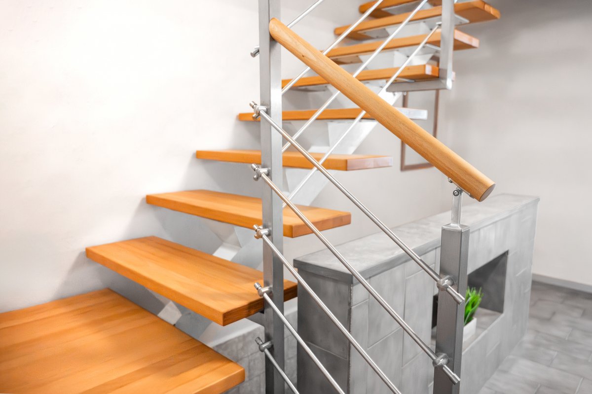 Ocelové zábradlí v kombinaci s dřevěnými madly a masivními nášlapy dodává interiéru eleganci i funkčnost. Vhodné do moderních i nadčasových prostor.