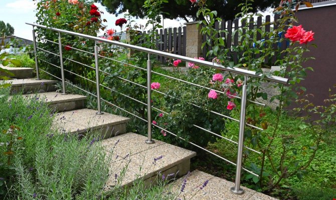 Nerezové zábradlí s prutovou výplní - vhodné jak pro interiér, tak i pro exteriér. Obvyklý počet výplní: 4 - 5 prutů, profil: kulatý x hranatý, kotvení: vrchní x boční. Vyrábíme a montujeme po celé České republice, občas i v zahraničí.