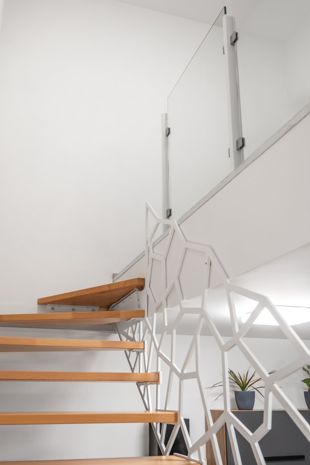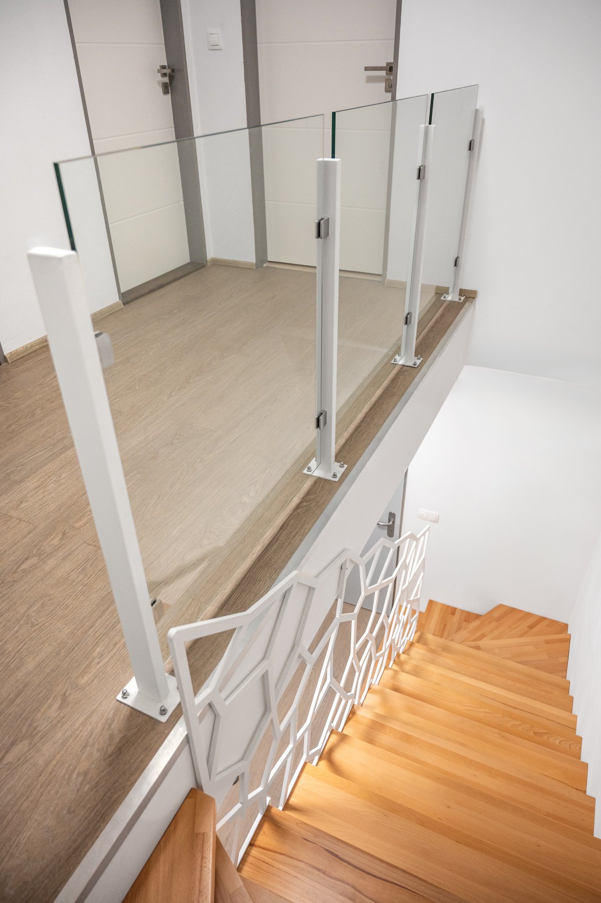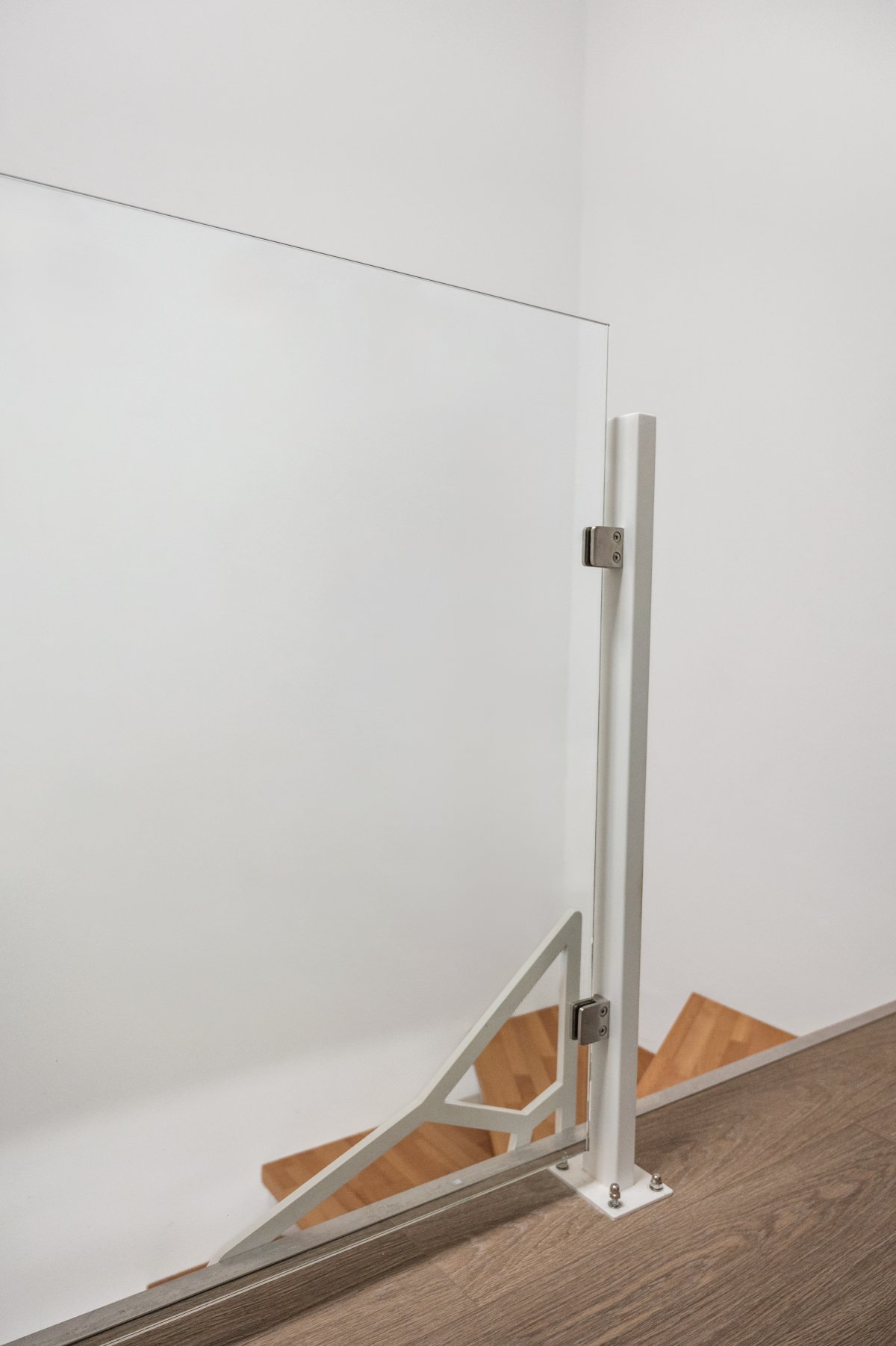 Bílé ocelové sloupky s nerezovými držáky dodávají zábradlí čistý vzhled a perfektně ladí s interiérem.