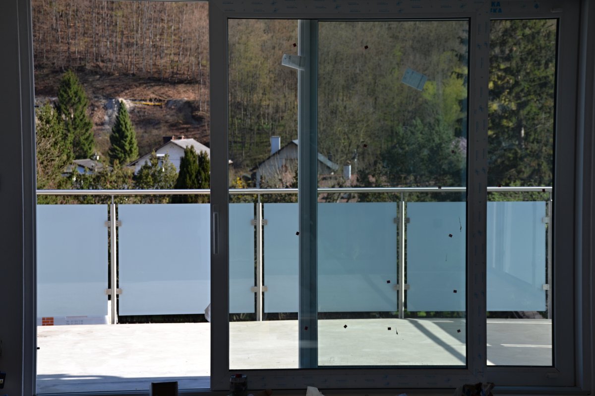 Balkonové zábradlí s mléčným sklem + nerezové sloupky doplněné o nerezové madlo z naší široké nabídky.